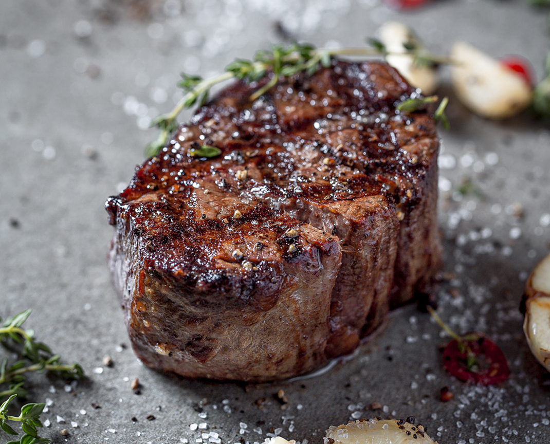 • Стейк миньон, печеный мятый картофель, соус дижонский